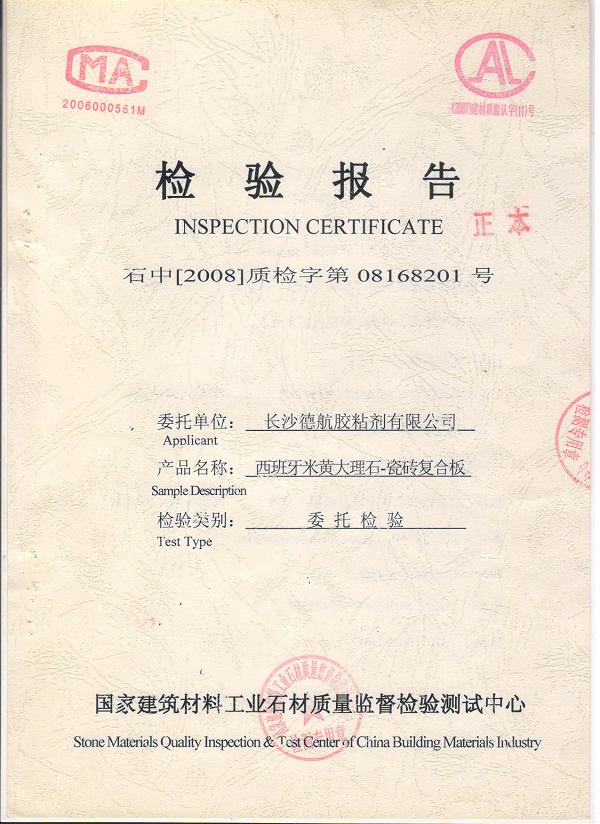 1、使用通用環(huán)氧128,配合MH-233固化劑,添加混合量一倍的400目活性硅微粉,制作成D-1518A/B潮濕面膠黏劑,用于西班牙米黃-瓷磚復(fù)合板的制作。2、樣品制作流程:所用的西班牙米黃和瓷磚均泡水24小時(shí),從水中取出后放置30分鐘晾干,復(fù)合膠配比為2:1,采用雙面上 膠粘接,3H后下架子,4H后對(duì)剖。此信息由生產(chǎn)單位南安市萬源石業(yè)有限公司提供。