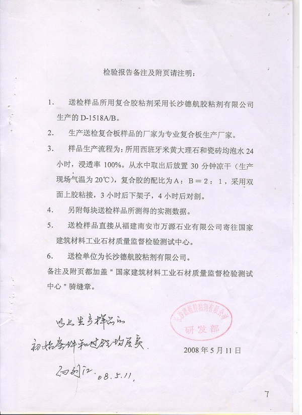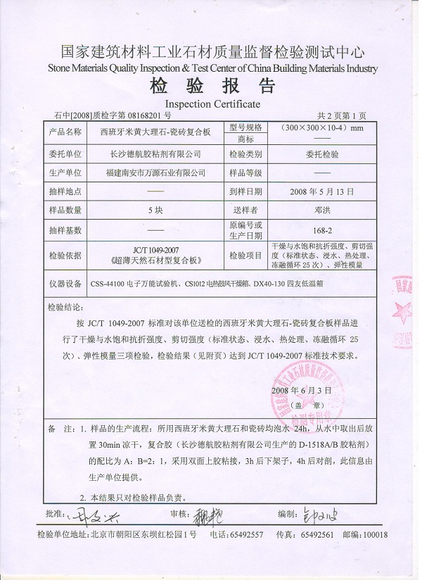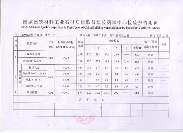 3、按照J(rèn)C/T1049-2007《超薄天然型石材復(fù)合板》標(biāo)準(zhǔn)進(jìn)行檢測(cè)。國家建筑材料石材質(zhì)量監(jiān)督檢驗(yàn)測(cè)試中心檢測(cè)結(jié)果于下: